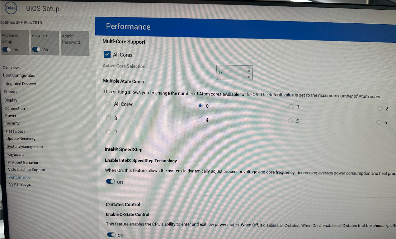 BIOS -> Performance -> Multiple Atom Cores 부분